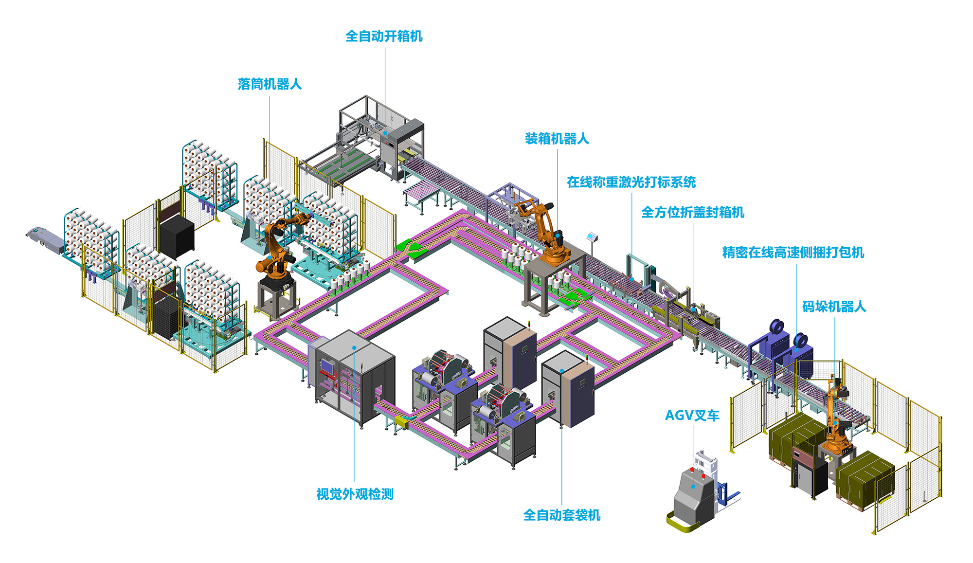 機器人落筒→視覺智能外觀檢測(等級分揀)→自動稱重(等級分揀)→自動套袋→自動開箱→機器人裝箱→激光打標→全方位智能封箱→自動捆扎(世界先進的捆扎系統)→機器人碼垛(機器人+AGV協作,碼垛+轉移)